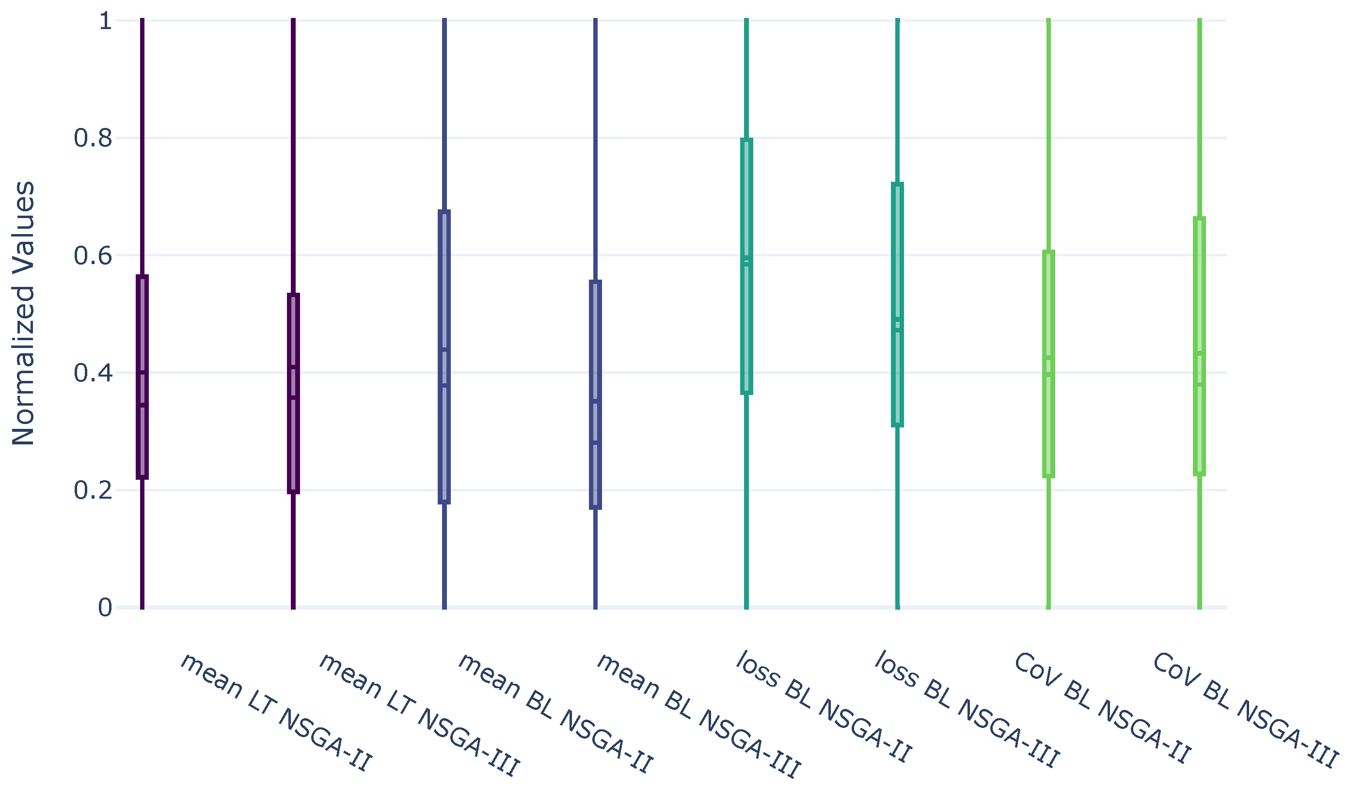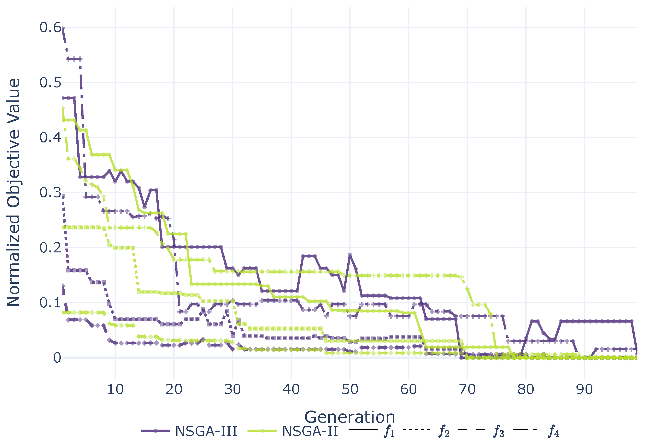 - Deb, K.; Jain, H. An Evolutionary Many-Objective Optimization Algorithm Using Reference-Point-Based Nondominated Sorting Approach, Part I: Solving Problems with Box Constraints. IEEE Trans. Evol. Comput. 2014, 18, 577–601. [Google Scholar] [CrossRef]