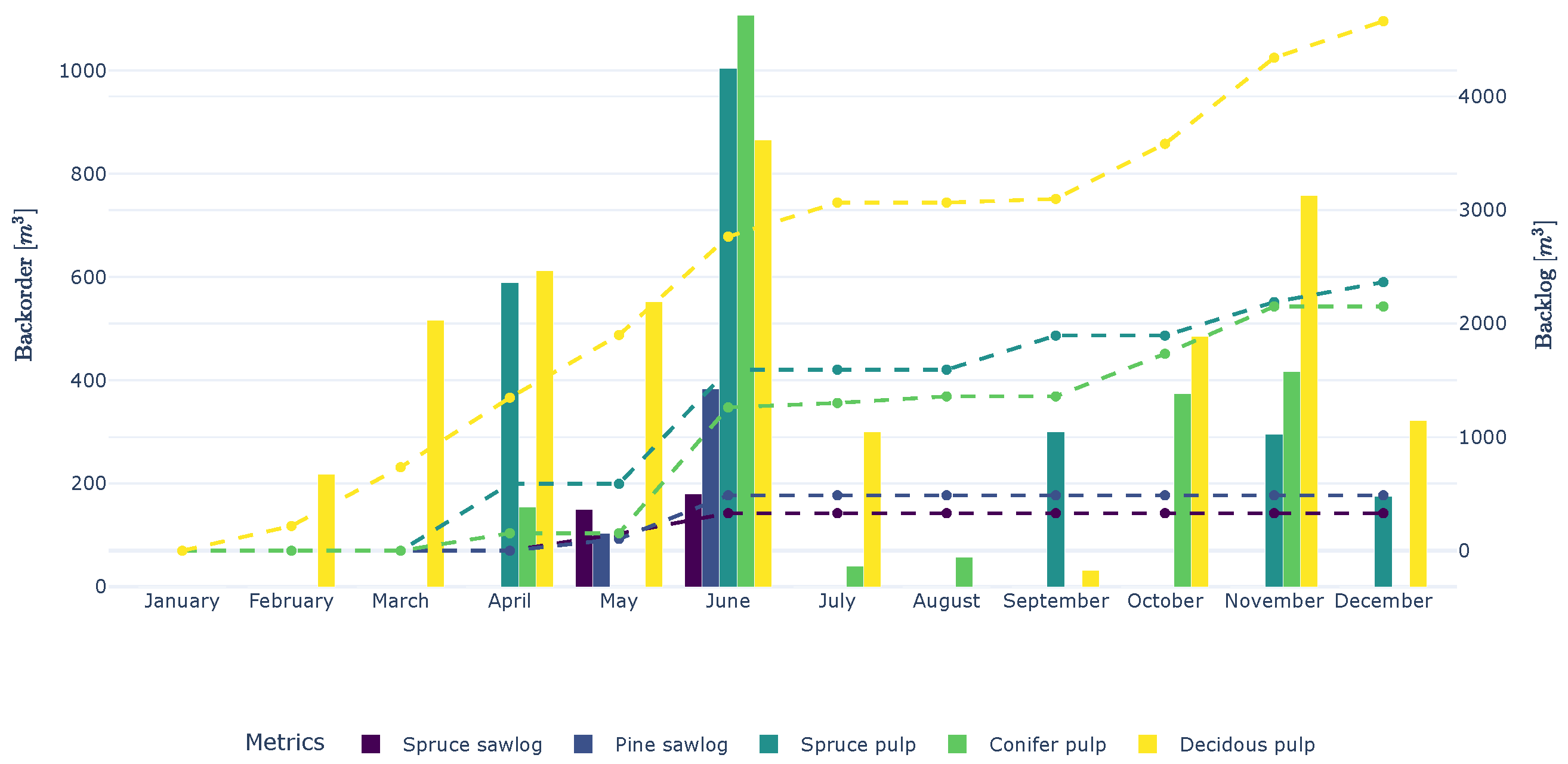 - Westlund, K.; Ng, A.H. Analyzing Delivery Performance and Robustness of Wood Supply Chains Using Simulation-Based Multi-Objective Optimization. In Proceedings of the 2024 Winter Simulation Conference (WSC), Orlando, FL, USA, 15–18 December 2024; IEEE: Piscataway, NJ, USA, 2024; pp. 1587–1598. [Google Scholar] [CrossRef]