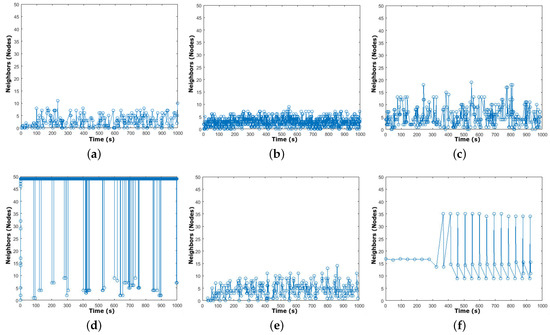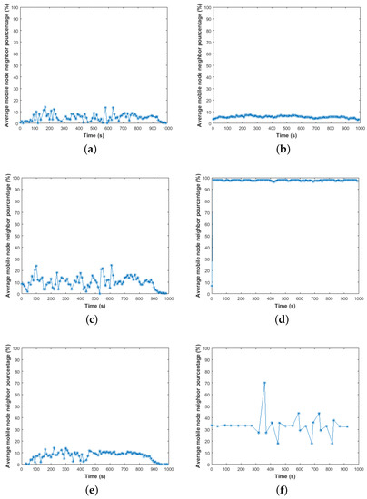 This metric describes the cumulative percentage of the total number of neighboring nodes. That is the percentage of total MNs’ neighbors during the whole validation time. Low values of this metric reflect the degree of model instability in attaining neighbors, which further leads to worse network performances [12]. To strongly verify the results shown in Figure 3, we validate the average neighbor percentage during the simulation. Figure 4 shows the results of this feature. We can highlight the following.