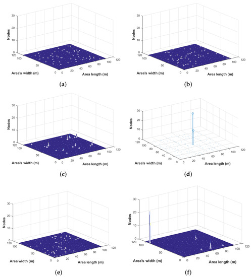 - Figure 5d shows the best results, with all mobile nodes being located within one area which is governed by a nomadic leader while moving. This proves that all the nodes belong to just one reference point. The outcome of Figure 4d is exemplary with nearly 98% of nodes gathering together due to the concentrated spatial distribution of all nomadic nodes in one specific area.