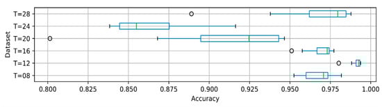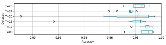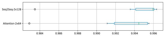 By comparing Seq2Seq-2x128 and Attention-2x64 results, we can see that the model with an attention mechanism (Attention-2x64) is much more stable with both shorter and longer sequences, as high recognition accuracy was achieved on almost all folds. The basic sequence–sequence encoder–decoder model, on the other hand, does not perform as well as the model with attention mechanism, and the results of each fold have more variability, as indicated by a larger interquartile range (see, e.g., sequences of T = 20 and T = 24).