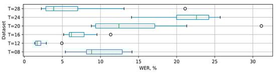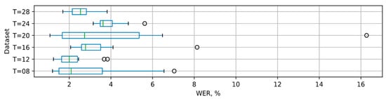 The WERs, of which models managed to achieve during cross-validation, are presented in Figure 6 and Figure 7. It is apparent that the Seq2Seq-2x128 model is less stable, as compared to the attention-2x64 model with an attention mechanism, as indicated by higher interquartile range.