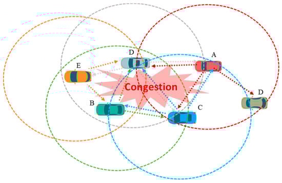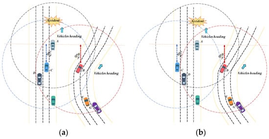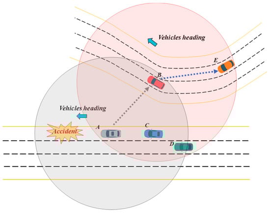 Based on the wireless access in vehicular environment (WAVE) standards employing dedicated short-rage communication (DSRC) technology, vehicles exchange basic safety messages (BSM) with other vehicles that are in the wireless range. The BSM comprise the information, such as the position, speed, direction, and other dynamic information, of the vehicle []. Once each vehicle receives BSMs from its neighbor vehicles, it can construct a local dynamic map (LDM). An LDM updates the moving objects frequently, while keeping the road data unchanged. The period of updates can be an integer number of times in a second. The more often the process of exchange BSM, the higher the accuracy of a dynamic state of neighbor. It is therefore recommended to exchange BSM packet every 100 ms in WAVE/IEEE 1609 standard. It can be extended to a multi-hop range using clustering algorithms, such as in Reference [,]. Appling multi-hop dissemination methods based on a clustered network, emergency messages can be delivered up to an extended range. If the multi-hop dissemination is applied to all broadcast messages, like BSMs, it imposes excessive traffic overhead since duplicate transmissions can lead to a broadcast storm, as defined in Reference [].