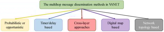 To address the rebroadcasting problem, therefore, new approaches to broadcast efficient message dissemination have been proposed. Several approaches use network parameters, such as inter-vehicle distance, in various ways to select a relay vehicle. For instance, in Reference [,], inter-vehicle distance is used to compute the probability that each receiver becomes a relay node. In Reference [], the same parameter determines the delay in which the receivers compute in a distributed manner and wait prior to a rebroadcasting phase. It introduces a so-called broadcast suppression algorithm similar to Reference [], where each receiver detects duplicate messages and avoids rebroadcasting them. Figure 2 shows various categories of message dissemination protocols that have been previously reported for VANET. Each category of these algorithms is summarized as follows.