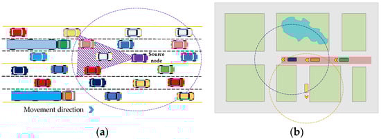 Example of broadcast dissemination process using Equation (5): (a) when A and B nodes are located in the same wireless range; (b) when A and B nodes are out of one another’s wireless range.