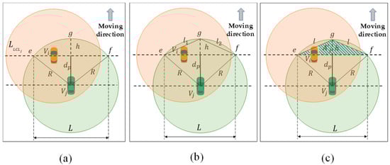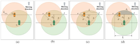 Here, is a heading angle of the source . and are the positions of on axis, respectively, while are the positions of on axis, respectively. For the sake of simplicity, we assume that is always perpendicular to of transmitting vehicle . A line segment is defined from point to point over , as shown in Figure 5c. Then, the length of can be expressed by Equation (2).