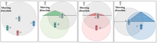 Applying our algorithm to the same network in Figure 5, we can analyze each receiver vehicle’s estimated waiting time. Using Figure 8, we are illustrating a similar example scenario, which is presented in Figure 5. In Figure 8, an upper sector area for each neighbor of transmitter node A is indicated in different colors. According to our proposed scheme, vehicle D has a longer positional distance and aligned movement with transmitter node A; hence, it acquires the smallest area compared to the other neighbors. The neighbor C is also one of the furthest receivers, but it has larger lateral distance with A and shorter positional distance. Due to this, it obtains a longer retransmission back-off timer when compared with B and D. Using our method, the messages can also be disseminated toward the desired direction without any overhead.