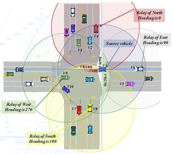 For instance, in Figure 9, receiver vehicle V9 can relay the data in both Western () and Southern ( directions. It computes a back-off timer for each direction using the value of corresponding upper sector area and lane difference . In Figure 9, V9 may give up the retransmission once it detects a duplicate message for the corresponding direction. As seen in Figure 9, vehicle V9 produces the smallest area over the -axis; thus, it becomes a relay node in which its retransmission originates a data propagation in the Western direction. On the other hand, V10 node may also contend to become a relay for the Western direction, owning to a large distance from V1 vehicle. Here, a lateral distance of V10 is larger than the lateral distance of V9. Due to this factor, V10 obtains a larger value, which eventually causes a longer back-off timer. In the proposed scheme, a designation of relay node relies on the back-off value obtained by each receiver using Equation (7). If a node obtains the smallest back-off timer, it designates itself a relay node earlier than other receivers, as aforementioned. Similarly, the V8 vehicle acquires the smallest back-off timer, after which it broadcast the duplicate message in the Southern direction. Thus, in this example, V9 dismisses its scheduled retransmission task due to the detection of a duplicate message from V8. Then, the V9 vehicle executes a rebroadcast of event message in the Western direction, which also dismisses a retransmission task scheduled by the V8 vehicle. Using this distributed concept, each relay node of a corresponding direction conducts self-designation and then propagates the event message in specific directions, as shown in Figure 9.