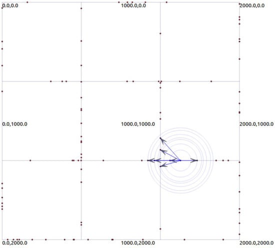 - An urban environment with well-known Manhattan grid (2000 2000 ) comprise 3 3 blocks and four-ways intersections [], as presented in Figure 10. All streets are two-way, with one lane in each direction. Car movements are constrained by these lanes. The direction of each node in every moment will be random. It cannot be repeated in two consecutive movements. Distance between two intersections is around 700 m. Speed of the vehicles is distributed randomly with 0.2 standard deviation. A density of the network varies from 12 and 62 .