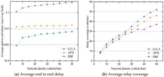 The simulation results were obtained for proposed and reference methods employing both highway, as well as urban, scenarios. According to the results, our method achieved significantly higher relay coverage and message delivery ratio. End to end delay is also reduced by 10 times when compared with reference methods in Reference [], whereas propagation distance is also elongated around 400 m with compared with Reference [].