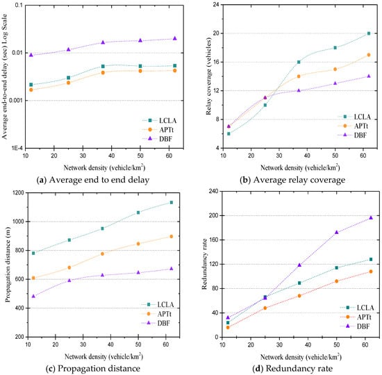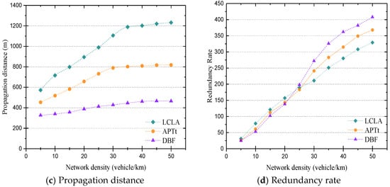 Figure 11d compares redundancy rate. It represents an average number of duplicate messages received by nodes. The graph shows a performance of all dissemination algorithms. As aforementioned, in sparse network, the distance is a decisive parameter. In a denser scenario, it is, however, less critical. In our method, a vehicle’s position can cause a significant change in the value of and . According to Figure 11c, the proposed algorithm performs the least redundancy in the densest scenario, whereas reference algorithms produce a smaller number of duplicate messages in sparse network conditions.