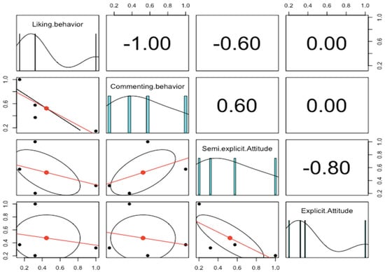 Figure 1 shows the data distribution of each factor and correlation values plus the significance levels. Spearman’s correlation was run to determine the relationship between user behavior and user attitude (12 pairs of variables). There was a strong positive correlation between commenting behavior and semi-explicit attitude (r = 0.57). In addition, it is shown that the data in both commenting behavior and semi-explicit attitude are distributed in the same direction.