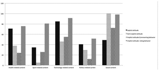To illustrate how implicit attitude derived from commenting and liking behavior is associated with semi-explicit and explicit attitudes, Figure 3 shows a topic-based comparison analysis between the three types of attitudes. The purpose of the comparison is to show how implicit attitude derived from liking or commenting behavior is consistent with explicit or semi-explicit attitude in terms of the preferred topics. For three topics, namely, health, technology, and politics, an implicit attitude derived from liking behavior is consistent with users’ explicit attitude, which indicates that tracking users’ liking behavior is sufficient to detect unwanted content for individuals. On the other hand, implicit attitude derived from commenting behavior is consistent with semi-explicit attitude derived from user-selected examples.