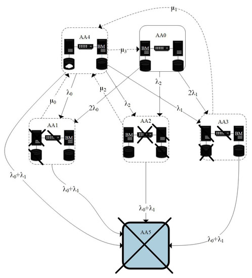 Depending on which element failed, the system goes into one of three states. For a model with organization Option A, when a computer fails, the system goes into state AA1, switch AA2, and hard drive AA3. If the system has the ability to recover, then, after repair, it goes into state AA4 with working elements. In state AA4, data are replicated between hard drives. If during replication some element fails, then the system will again go into the corresponding failure state (AA1, AA2, and AA3). If replication is completed and all the elements are functional, the system goes to its initial state (AA0 and B0). If during the repair an element of the backup computer fails, the system goes into complete failure mode.