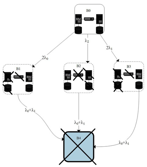 For each pair of physical servers allocated in the cluster that interact to support dynamic reconfiguration, state diagrams and transitions of the Markov model for organization variants A and B are shown in Figure 2 and Figure 3 The diagram shows the failure and recovery rates of the server and ; disk , ; and commutator , . The actual data replica is loaded onto the recovered disk (synchronization of the distributed storage system) with an intensity of . The VM startup time on the backup server and the user application loading on it are negligibly small in comparison with the loading of the current data replica; therefore, in this study, an instant switch between servers is assumed.