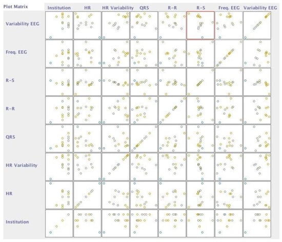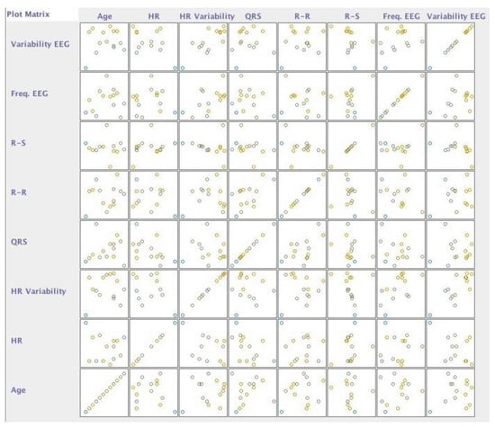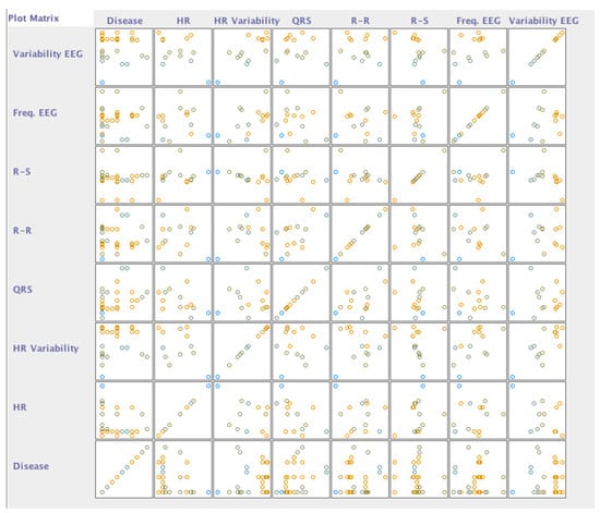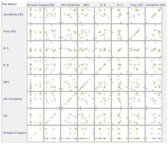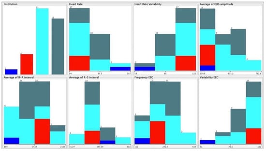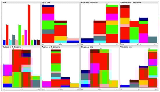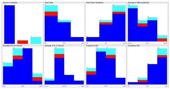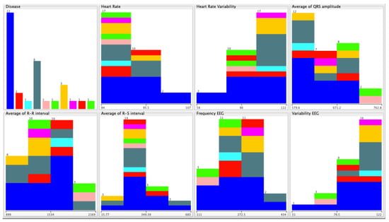 The subjects of this study had different diseases, and we verified, with the implementation of neural networks, which disorders did not correlate with the different acquired data. We confirmed that this was because we had a limited number of persons with each disease. However, the negative cases were correctly identified, reporting an accuracy between 89% and 98%, as shown in Table 6. The data were selected with WEKA software as presented in Figure 6, showing the classification dispersed by the different diseases in the following order (Figure 7): arterial hypertension, cardiac arrhythmia, arteriosclerotic coronary disease, heart failure, Parkinson’s disease, post-traumatic stress, depression, sequelae of surgery to brain injury, dementia of vascular etiology, and acute myocardial infarction.