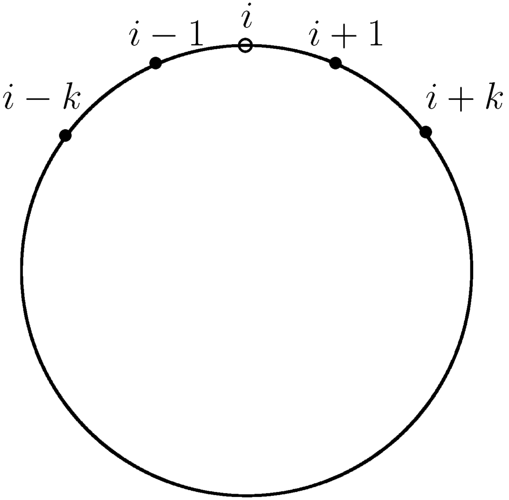 Ellison [] sets up a local interactions system in the circular city: Imagine our population of N economic agents being arranged around a circle.13 See Figure 2 for an illustration. In this context, one can define as the minimal distance separating players i and j. The shortest way between player i and player j can either be to the left or to the right of player i. Hence, is defined as: