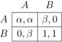 where and so that both and are Nash equilibria. Furthermore assume that so that A is risk dominant in the sense of Harsanyi and Selten [], i.e., A is the unique best response against an opponent playing both strategies with equal probability. Let