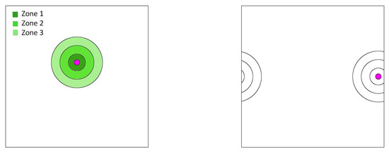 Beyond a certain distance from the blood vessel, cells may persist temporarily while unable to proliferate because of few to no resources. These are the assumed elements for our spatial, agent-based model. We imagine a blood vessel surrounded by zones of nutrient and androgen availability (Figure 1). We let zone 0 represent the space within the blood vessel itself. Cells that disperse into the blood are immediately swept away and become what are known as circulating tumor cells (CTCs) [36]. While not directly relevant to the present model, they are of empirical interest as CTCs become the source of metastases. Hence, in our model, we track the number and frequency of cells that become CTCs. Zones 1–3 (Figure 1) represent the successive distances from the blood vessel where the successive payoff matrices favor the predominance of , then and finally cells, respectively. The three matrices for zones 1–3 are shown in Table 1. The details of their derivation is given in Appendix A. In a non-spatial game where the three zones do not interact, these matrices each generate unique ESSs where the frequencies of , and are for zone 1, for zone 2, and for zone 3. Of interest is how the spatial game results in deviations from these non-spatial ESSs in each of the zones.