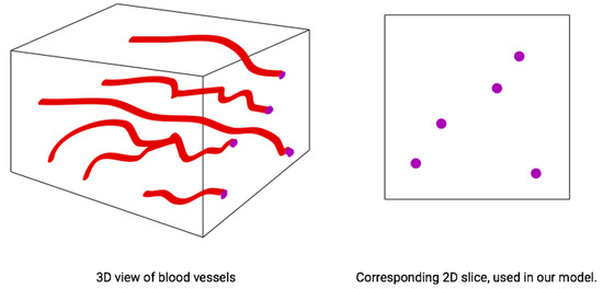 Cancer cells and blood vessels in a 3D space (left); and its 2D cross-section (right).