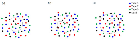A focal cell and its three neighborhoods (here we assume there are three cell types). (a) Density-dependence neighborhood: A focal cell can only proliferate if the density of cells within the disc defined by the density-dependence radius is below a threshold. (b) Frequency-dependence neighborhood: The focal cell’s likelihood of proliferating will be determined from an interaction between it and a randomly selected cell from within the frequency-dependence radius. (c) Dispersal neighborhood: If a focal cell proliferates, its daughter cell is placed randomly within the disc defined by the dispersal radius. Adapted from [13]. All the radii may vary with blood-vessel zone.