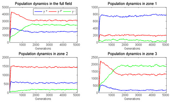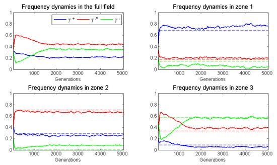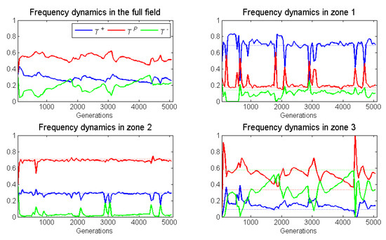 Figure 5 presents the frequency dynamics of a representative run for the full 5000 generations and for zones 1– Figure 6 presents the population dynamics of this same representative run.