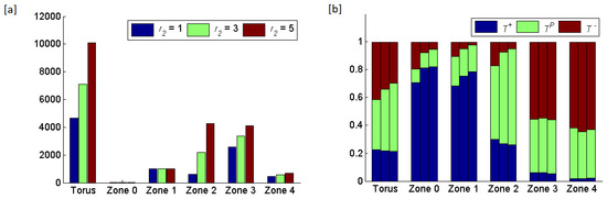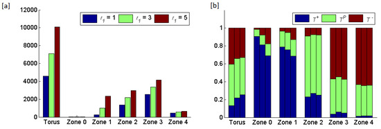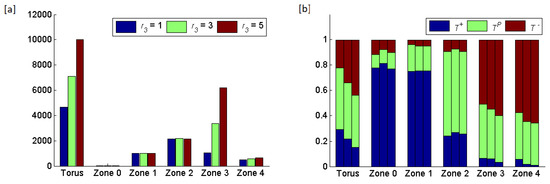 Results of increasing the radius of zone from 1 to 5, while keeping the radii of the other zones ( and ) at 3. (a) The total number of cells in the torus and in each zone. The average rates at which cells land in zone 0 and become circulating tumor cells are , , and cells per generation, respectively, for equal 1, 3 and (b) The frequencies of the three cell types per zone shown as triplets of stacked bars where the order of bars per triplet shows from left to the right.