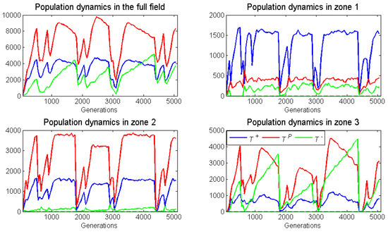 For dynamic blood vessels, population dynamics (same run as Figure 12) of the spatial game for each of the three cell types: across the whole space (top left); in zone 1 (top right); in zone 2 (bottom left); and in zone 3 (bottom right). The blood vessel switches location with a low probability of per generation, neighborless cells can proliferate (), and the zones have a broad width (). With each blood vessel switch, populations crash and then quickly recover.