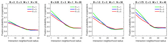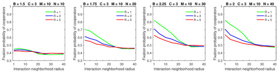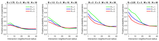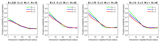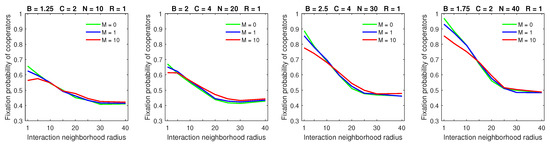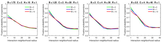 Finally, the breakdown of cooperation, which occurred in the probabilistic model in sparse populations with a small benefit-to-cost ratio, small strategic-interaction neighborhoods, a high mobility rate, and large dispersal neighborhoods [28], was no longer observed with deterministic dispersal (Figure 13). By a “breakdown of cooperation”, I loosely mean the phenomenon when the fixation probability of cooperators drops sharply to its lowest levels (e.g., to about 0.3, as shown in the leftmost graph of Figure 13). Therefore, cooperation can still be maintained—albeit at reduced levels—even in the worst-case scenario with deterministic dispersal.
