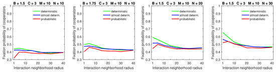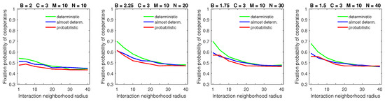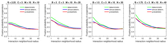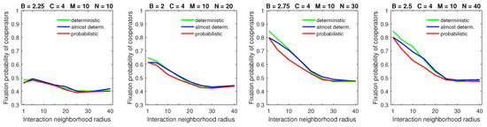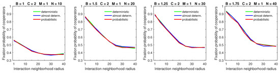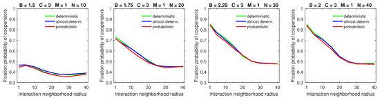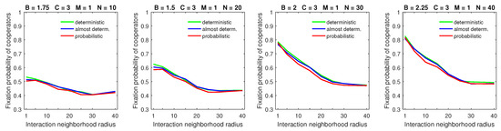 Increasing the size of the dispersal neighborhood in populations with a low mobility rate demonstrated a small advantage of deterministic dispersal patterns over the probabilistic one for cooperators; see Figure 9 for and Figure 10 for . This is consistent with the overall principle that introducing mobility at a low rate does not effect a significant change in the fixation probabilities of cooperators. In this situation, different types of dispersal behavior are not going to produce significant variation in fixation probability.