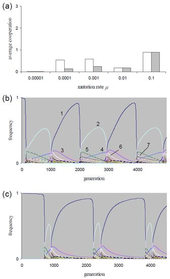 (a) Average execution of cooperation per game () as function of mutation rate in X3-simulations of dgm-populations (white) and of cgm-populations (gray). For rates μ = {10−5, 0.01, 0.1}, averages are sampled at equilibrium, and for rates μ = {0.0001, 0.001}, averages are sampled over a cycle period (see panel (b,c)). Fixed parameters: P = 0.05, T = 5, S = 0, R = 3, K = 0; (b) For the conditions of panel (a), the frequency dynamics of an evolving dgm-population at rate μ = 0.001. 1: ddddddd (AllD); 2: cdddddd (TfT1); 3: ddddddc; 4: ddcdddd; 5: cdcdddd (TfT2); 6: dcddddd; 7: dccdddd; (c) For the conditions of panel (a), the frequency dynamics of an evolving cgm-population at rate μ = 0.001. Panel (b,c) use the same line code.