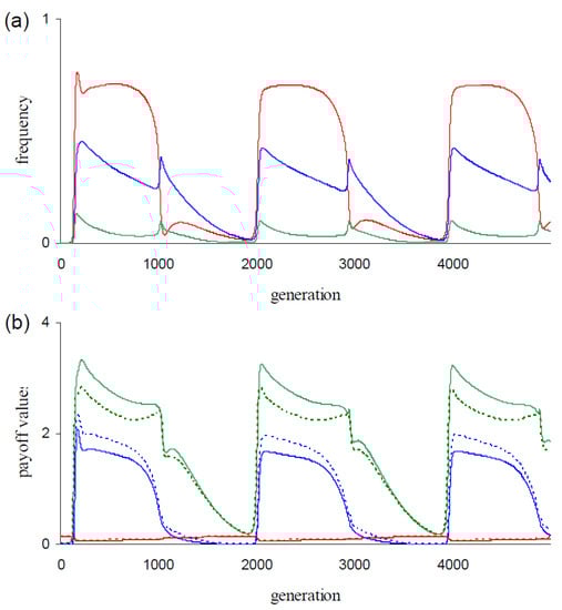 The strategy dynamics in Figure 1b,c resemble those in the corresponding simulations with the lower mutation rate μ = 0.0001. All four cycles show (as in Figure 1b,c) alterations of phases with dominance of AllD followed by phases with dominance of TfT1 (cdddddd). As can be inferred from these dynamics, AllD respectively TfT1 have the highest fitness when invading the populations. Consequently, these populations express periodic indirect effects. In Figure 2, we give behavioral statistics from the simulation of Figure 1b. Figure 2a shows the dynamics of the mean number of executed C actions for each round of the game (, i = {1, 2, 3}). Cooperation is more intensively executed during TfT1 phases, especially in round 1 (Figure 2a). The relatively longer TfT1 phase durations in the dgm-populations (compare Figure 1b with Figure 1c) explain that -values are higher in dgm-populations than in corresponding cgm-populations (Figure 1a at μ = {0.0001, 0.001}).
