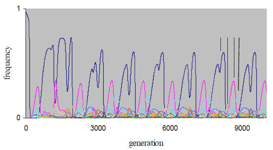 The frequency dynamics of an X4-simulation at {P, μ} = {0.3, 0.01}; other conditions as in Figure 1. The four vertical lines indicate the position of a respective dominance phase of strategies {AllD, ddcdddddddddddd, TfT1, dddddcddddddddd}.