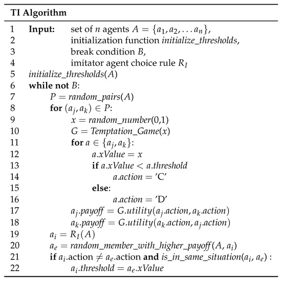 Figure 1 provides the pseudo-code describing the structure of the Threshold Imitation (TI) algorithm that implements the simulation model. The input parameters are in lines 1–4, the initialization is in line 5, the agents’ interaction is in lines 7–18, and the learning is in lines 19–22.