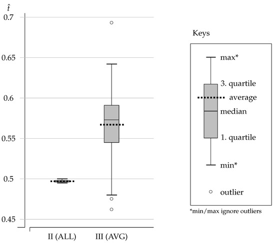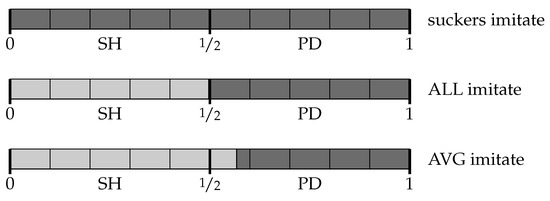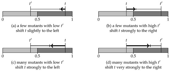 Under “AVG imitate”, two strategies t and affect each other more when their initial distance is greater. Moreover, t is more responsive to than to . Finally, the group with an initial larger size tends to exercise more pull on the competing group. Figure 7 illustrates these features. As usual, we identify the strategy with its threshold t: we color the values for t in light gray if the strategy is ES, and in dark gray otherwise. Thick arrows represent the displacement of a population’s strategy with threshold t. Shifts in the invading strategy are shown as thin arrows for small invasions and as regular arrows for large invasions.