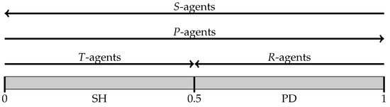 Suppose : the shared categorization is not ES and this population is more likely to see R-agents than P-agents. Consider an invasion from a small group of mutants who play an ES strategy with . The interaction of mutants with incumbents over a game with generates T-agents. Mutants with a low , who imitate R-agents, increase their threshold. Incumbent agents decrease their threshold when they turn out as S-agents or R-agents. However, R-agents are more frequent, because incumbents are more likely to interact within their group than across. Moreover, R-agents never imitate; see Figure 5 (right). Because T-agents imitate R-agents (but not vice versa), the incumbent population with resists invasion from mutants with at the cost of a small change in their new shared threshold.