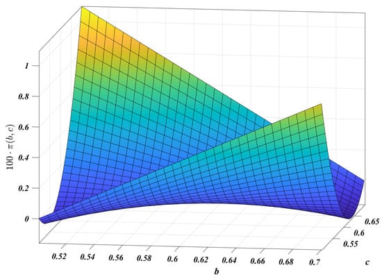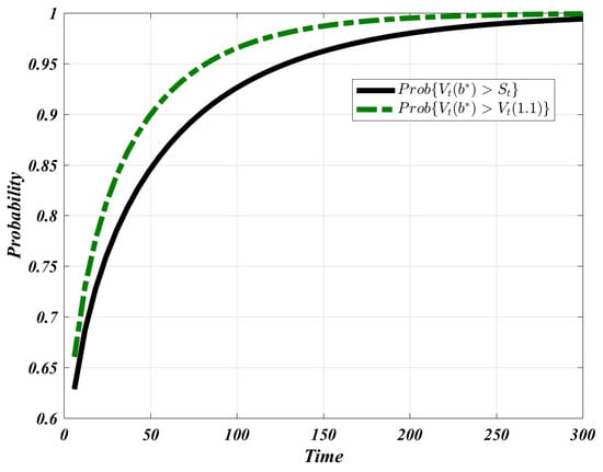 where is the cumulative normal distribution function and denotes the growth rate of b during diffusion. The outperformance probabilities for this particular experiment () are plotted in Figure 4 for .