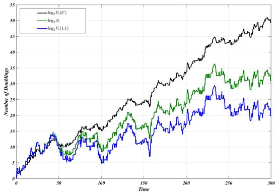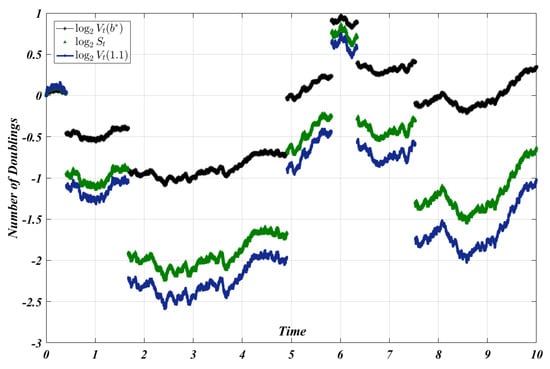 To close the paper, we simulate some gameplay for a market with a single stock that diffuses according to the parameters , , and . We assume a risk-free rate of , and that jumps arrive at an expected rate of per year. On jumps, the gross-returns will be distributed according to “Shannon’s Demon” (Poundstone 2010 [10]), e.g.,
