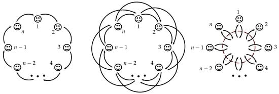 where negative indices are determined modulo n, that is whenever , we replace j by . In essence, what Mechanism (1) does is that every player obtains the payment from each of her/his m predecessors, where is the multiplier of redistribution (“rate of return”). Equivalently, every player’s payment is equally distributed over her/his m successors. We therefore refer to Equation (1) as a GCM with range m, or simply “m-GCM”. To relate with the Introduction, note that for , we obtain a mechanism where each player makes a payment to her/his immediate neighbor (“simple giving circle”). If , the resulting mechanism is the LPGM. For varying m, the scheme thus interpolates gradually between the simple giving circle (1-GCM) and the LPGM (n-GCM); see again Figure 1.