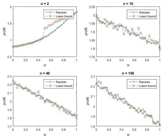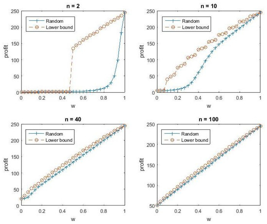 Propositions 3 and 4 formally demonstrate that it may or may not be optimal for the criminal to return files depending on how sensitive victim beliefs are to the criminal’s actions. We considered, however, the relative extreme cases of and n large. To explore what happens in the middle ground we report the results of simulations in which we see how the profit of the criminal is influenced by n. In the simulations we consider the linear distribution of valuations .8 We track the profits of the criminal over 1000 victims. Throughout we assume that victims start with the ‘optimistic’ initial belief and then update beliefs according to Equation (12). Each data point is the average of 1000 simulations.