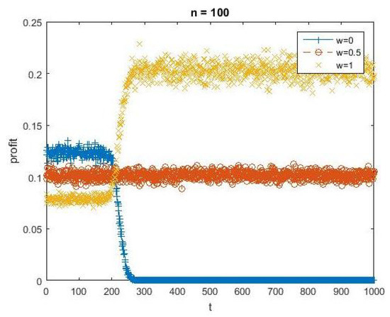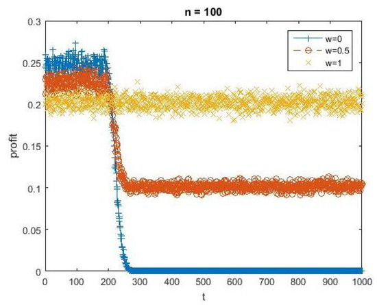 To illustrate the criminal’s trade-off in choosing between a high and low probability of returning files consider Figure 3. This plots profit over time for three different values of w when and . We can see that the strategy of never returning files succeeds in the short run because it takes time for victims to update beliefs. But, over the long run the strategy of always returning files is a clear winner.