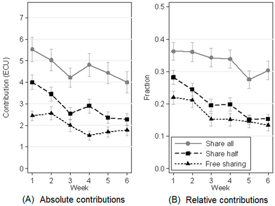 Absolute and relative contribution over time. Waiters’ observed contribution under different sharing rules over time (each week contains 7 rounds). Mean contribution under Free sharing (R1, triangles), under Share Half (R2, squares) and under Share All (R3, circles). Standard error bars in gray. (A) Absolute contributions are sensitive to sharing rules and show an overall decrease over time. (B) Relative contributions show the same trends.