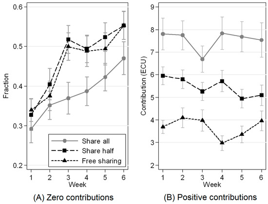 Count data are known to be Poisson-like and in fact the frequency distribution of our data is bound at zero with a long positive tail, a mode at 0 ECU, the median at 1, the mean at 5.67 and the variance at 29.51. Figure 2 displays the same observed means reported in Figure 1A, but split in zero and positive contributions. Splitting the waiters’ data allows us to observe the different effects of sharing rule and time separately on the two processes modeled by the hurdle model. Zero contributions increased with time, from 32% of all contributions in the first week to 53% in the last, while there were no clear differences among sharing rules (see Table 1A). On the contrary, positive contributions remained fairly constant over time but showed differences across sharing rules: Mean contributions were 3.69 ECU = 23% for Free Sharing, 5.51 = 35% for Share Half and 7.55 = 48% for Share All. Thus, for positive contributions, Share Half increased contribution by 49% over Free Sharing, while Share All caused an increase of 105% over Free Sharing and 37% over Share Half.