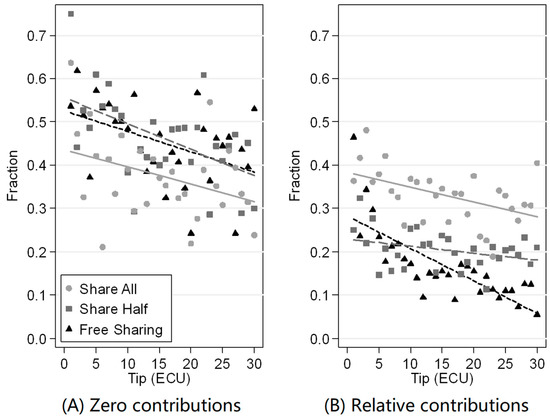 Moreover, zero contributions were less likely at higher tips (for the “rich”). In a somewhat opposite direction, the percentage of tip contributed was higher for lower tips (for the “poor”), but at the same time the effect of a sharing rule was more apparent at higher absolute tips than lower tips.