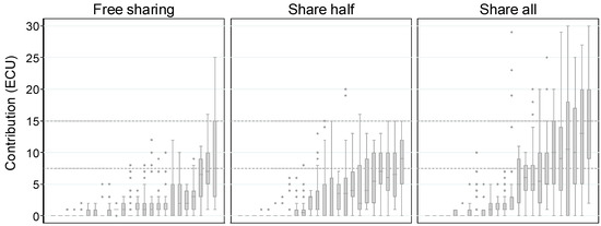 Individuals. Each bar shows the boxplot of a participant. Within each treatment, individuals are ordered by their mean contribution. The upper horizontal dashed line marks the average endowment over 42 periods (15 ECU, that corresponds to contributing everything on average). The lower dashed line marks half of the average endowment (7.5 ECU, corresponding to contributing half of the endowment on average).