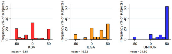 The mean amount which was donated/taken was €−3.64 to KSV, €16.62 to ILGA and €34.80 to UNHCR. All means are significantly different from each other (all p-values < 0.01) and we, therefore, see strong signs of discrimination between the three organizations by our participants. As can be seen in Figure 1, the distribution of amounts donated/taken varied strongly between the three organizations. Among our participants a share of 38% decided to take, and 32% decided to neither take nor donate to the KSV; 15% decided to take, and 22% decided to neither take nor donate to the ILGA; and 5% decided to take, and 10% decided to neither take nor donate to the UNHCR.
