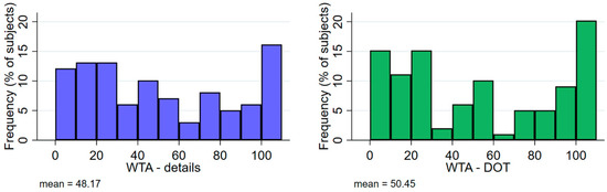 Distribution of willingness to accept (WTA) bids across personal details and DOT decisions.