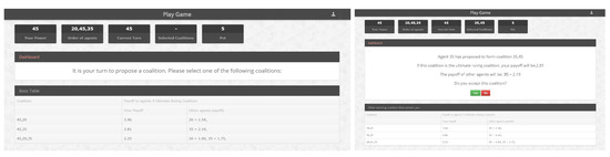 We developed our own software to implement the games. The left panel of Figure 1 is a screenshot of the proposal stage, and on this screen the available information includes the agent’s power, other agents’ power and their order of proposal, the current turn, the proposed coalition, the pot, the coalitions available for proposal (i.e., those with sufficient power to win), and the corresponding payoffs of each agent in any potentially proposed coalition (if the proposed coalition becomes the ultimate ruling coalition). The randomly chosen agent then must propose one coalition to the other agents in the game.