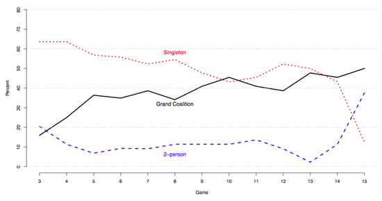 Very few grand coalitions form compared to the proportion of singletons (a dictatorship) during the early games of the experiment. However, the proportion of grand coalitions significantly increases in later games.