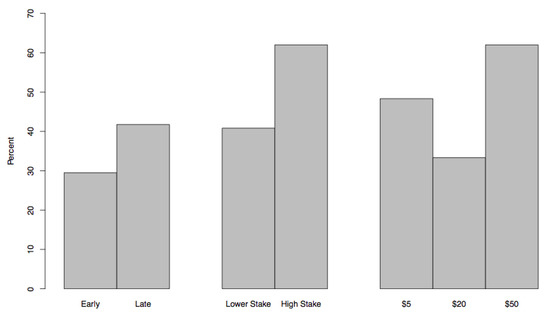 One of the unresolved issues in experiments in coalition formation (or economic experiments in general) is whether representative (small) experimental stakes translate into behavior that reflect situations in the real world. Harrison and List [31] provide an excellent review of varying stakes in economic experiments—the question here is whether they are non-trivial enough to induce agents to reveal their true behavior. To make the stakes appear more substantial, several experiments have been conducted in developing countries where participants are poor enough to make the stakes more salient; for instance, Slonim and Roth [32] ran their experiments in the Slovak Republic, Kachelmeier and Shehata [33] in China, and Cameron [34] in Indonesia, among others. The stakes in these experiments equaled roughly 62.5 hours of work in Slovakia or three times the monthly expenditure of the average participant in Indonesia. The effect was somewhat mixed, in that some high-stakes cases, such as the Slovak Republic study, induced different behavior to that obtained with lower stakes, while in the Indonesian study it did not do so.